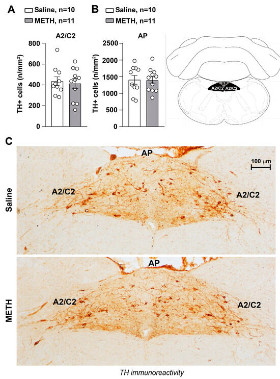 Within A2/C2 and AP, METH does not decrease catecholamine neurons. Immunohistochemical analysis for TH was performed in dissected brains of mice following repeated METH administration (5 mg/kg, i.p., for 5 days). Mice were sacrificed 60 min following the METH challenge, which was carried out on day 11. TH-positive cell density (n/mm2) counted in saline- and METH-treated mice is shown in (A,B), respectively. Values are the means ± S.E.M. Representative images or TH-positive neurons in A2/C2 and AP of mice treated with saline or METH are shown in (C).
