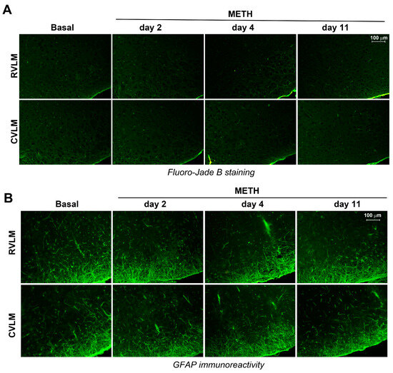 The presence of degenerating neurons in the RVLM/CVLM of mice subjected to METH treatment was assessed across the time windows between the first and the last injection by the Fluoro-Jade B staining (Merk Millipore; code: #AG310), as previously described [87,88]. Briefly, deparaffinized sections (10 m) were incubated for 30 min at RT in a 0.1% (v/v) acetic acid solution containing 0.001% (w/v) Fluoro-Jade B.