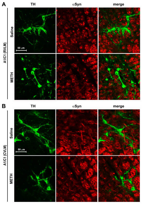 METH does not increase αSyn within A1/C1 neurons of the RVLM and CVLM. Double immunofluorescence for the catecholamine marker TH and αSyn was performed in the RVLM and CVLM of mice following repeated injections of saline or METH (5 mg/kg, i.p., for 5 days) and sacrificed 60 min after the METH challenge, which was carried out on day 11. Representative images of the double immunostaining for TH and αSyn in A1/C1 within the RVLM and CVLM of mice treated with saline or METH are shown in (A,B), respectively.