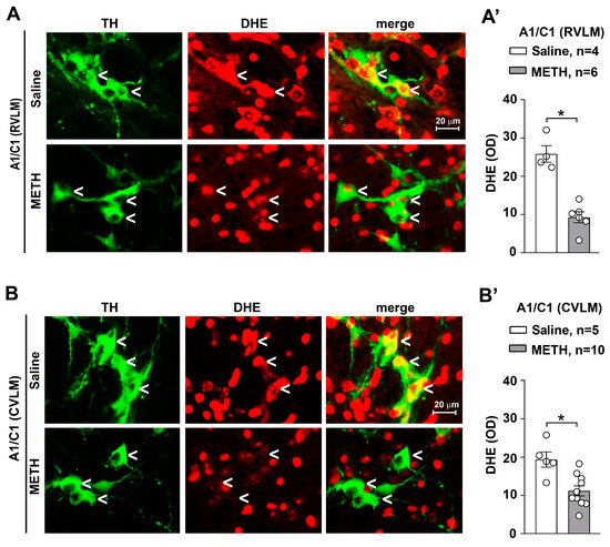 Repeated administrations of METH lead to intracellular reduction of free radicals in catecholamine A1/C1 neurons of the RVLM and CVLM. Double fluorescent analysis for TH-immunoreactivity for the catecholamine marker TH and αSyn was performed in the RVLM and CVLM of mice subjected to repeated injections of saline or METH (5 mg/kg, i.p., for 5 days) and sacrificed 60 min after the challenge carried out, on day 11. Representative images of the double immunostaining for TH and αSyn in A1/C1 within the RVLM and CVLM of mice treated with saline or METH are shown in (A,B), respectively. The respective densitometric values of DHE stain optical density (OD) are shown in (A’,B’), respectively. Values are the means ± S.E.M. * p < 0.05 (two-tailed Mann–Whitney test).