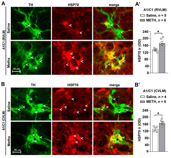 Repeated administrations of METH increase HSP70 within A1/C1 neurons. Representative images of the double immunostaining for TH and HSP70 in A1/C1 within the RVLM and CVLM of mice treated with saline or METH are shown in (A,B), respectively. The densitometry values (OD: Optical Density) of HSP70 immunoreactivity (ir) are shown in (A’,B’), respectively. Values are the means ± S.E.M. * p < 0.05 (two-tailed Mann–Whitney test).