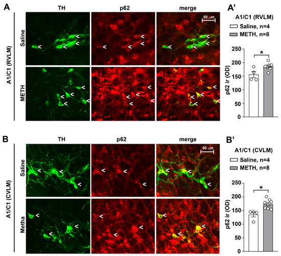 Following METH administration, p62 increases within A1/C1 neurons of the RVLM and CVLM. Double immunofluorescent analysis for TH and p62 was performed in the RVLM and CVLM of mice some days following METH administration. Representative images of double immunostaining for TH and p62 in A1/C1 within the RVLM and CVLM of mice treated with saline or METH are shown in (A,B), respectively. The values of p62 are shown in (A’,B’), respectively. Values are the means ± S.E.M. * p < 0.05 (two-tailed Mann–Whitney test).
