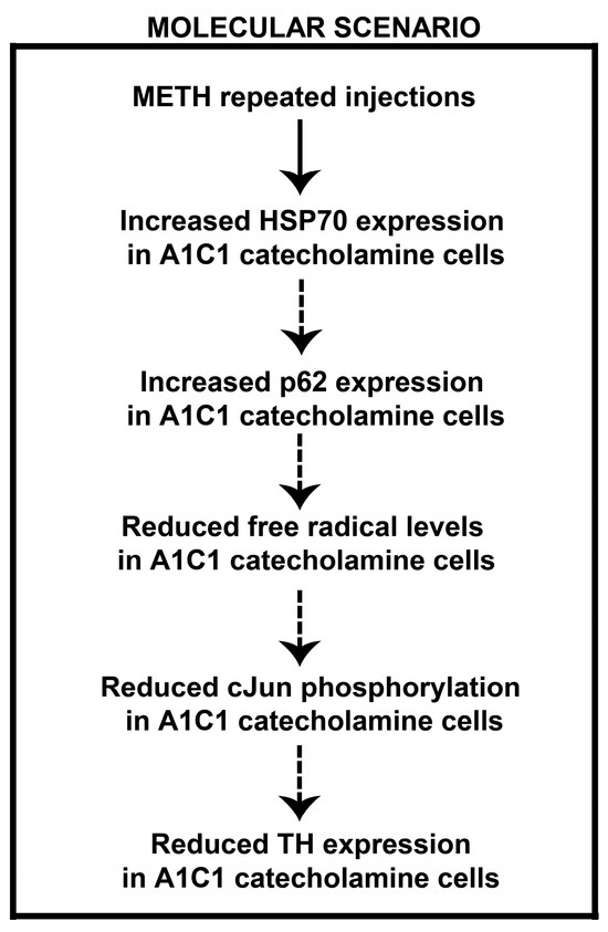 Diagram showing a possible molecular scenario occurring in response to repeated METH exposure in A1/C1 catecholamine neurons. Our findings demonstrate that, following repeated METH exposure, increased expression of HSP70 and p62 occurs in A1/C1 catecholamine neurons in the RVLM and CVLM. The consequent antioxidant effect may be responsible for the observed reduced intracellular levels of free radicals in the same cells. This may underlie a reduced phosphorylation of the transcriptional factor cJun and a downregulated expression of TH with a consequent phenotypic shift of the A1/C1 catecholamine cells within the RVLM and CVLM. The expression of p-cJun, which is also a marker of neuronal activity, is suppressed in the withdrawal phase following METH administration. This remains a quite general marker, which should be implemented by dedicated electrophysiological studies to be carried out in specific future research projects. Dotted arrows indicate that a causal relationship between each event is not demonstrated. This hypothesis warrants further investigation.