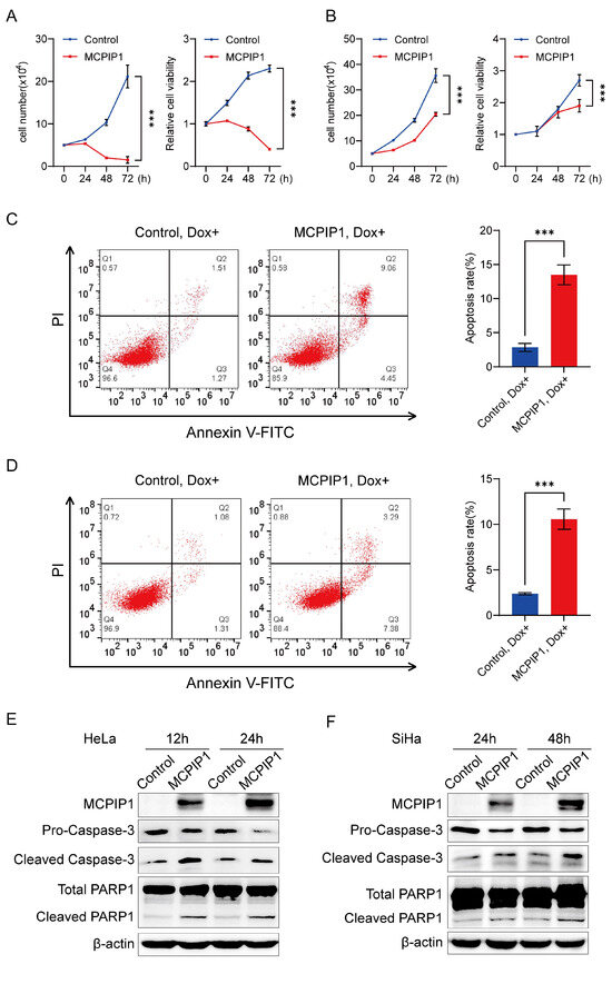 MCPIP1 promotes the apoptosis of cervical cancer cells. (A,B) The overexpression of MCPIP1 suppressed the proliferation of HeLa (A) and SiHa (B) cells, as assessed by the cell counting assay and CCK-8 assay. Data have been represented as mean ± SD. n = 3. (C,D) Flow cytometry assay for apoptosis detection of HeLa (C) and SiHa (D) cells infected with lentivirus of control or MCPIP1 and treated with 1 μg/mL doxycycline for 24 h and 48 h, respectively. Representative images were shown in the left panel. The apoptosis rates from three independent experiments were shown in the right panel. (E,F) Protein expression levels of MCPIP1, pro-caspase-3, cleaved caspase-3, total PARP1, and cleaved PARP1 were detected by Western blotting in HeLa cells (E) infected with lentivirus of control or MCPIP1 and treated with 1 μg/mL doxycycline for 12 and 24 h, respectively, or in SiHa cells (F) infected with lentivirus of control or MCPIP1 and treated with 1 μg/mL doxycycline for 24 and 48 h, respectively. β-actin was used as a loading control. *** p < 0.001.