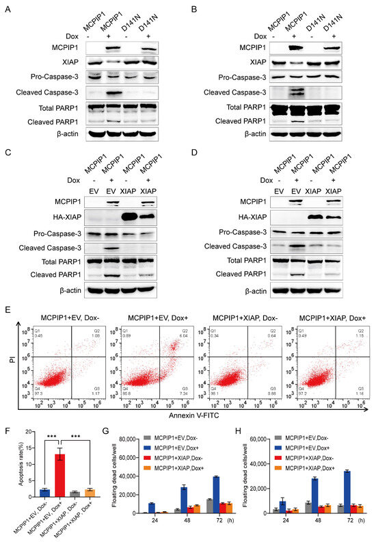MCPIP1 facilitates cervical cancer cell apoptosis via XIAP. (A,B) Protein expression levels were detected by Western blotting in HeLa (A) or SiHa (B) cells, which were infected with a lentivirus of MCPIP1 or D141N and treated with or without 1 μg/mL doxycycline for 24 and 48 h, respectively. β-actin was used as a loading control. (C,D) HeLa (C) or SiHa (D) cells were co-infected with a lentivirus of MCPIP1 and pLVML-3×HA-MCS-IRES-Puro (EV) or pLVML-3xHA-XIAP (XIAP) and treated with or without 1 μg/mL doxycycline for 24 and 48 h, respectively. Then, Western blotting was performed with primary antibodies to MCPIP1, HA tag (HA-XIAP), pro-caspase-3, cleaved caspase-3, total PARP1, and cleaved PARP1. β-actin was used as a loading control. (E,F) A flow cytometry assay was utilized for the apoptosis assessment of HeLa cells co-infected with a lentivirus of MCPIP1 and XIAP and treated with or without 1 μg/mL doxycycline for 24 h. Representative images (E) and statistical analysis based on three independent experiments (F) were shown. (G,H) The floating dead cells were counted from the HeLa (G) and SiHa (H) cells after co-infection of the MCPIP1 and XIAP lentivirus and treated with or without 1 μg/mL doxycycline for 24, 48, and 72 h. *** p < 0.001.