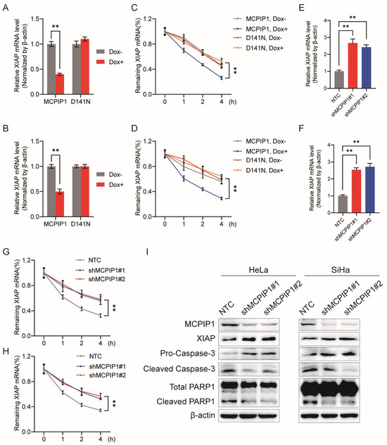 MCPIP1 attenuates XIAP mRNA’s stability, leading to its downregulated mRNA and protein expression. (A,B) HeLa (A) and SiHa (B) cells were infected with a lentivirus of MCPIP1 or D141N and treated with or without 1 μg/mL doxycycline for 24 and 48 h, respectively. Then, the XIAP mRNA levels were determined by RT-qPCR analysis. (C,D) HeLa (C) and SiHa (D) cells were infected with MCPIP1 or D141N lentivirus and treated with or without 1 μg/mL doxycycline for 24 h and 48 h, respectively. Then, cells were treated with 5 μg/mL actinomycin D for 0, 1, 2, and 4 h and collected to detect the remaining mRNAs of XIAP by RT-qPCR. (E,F) HeLa (E) and SiHa (F) cells were infected with the lentivirus of NTC or shRNAs to MCPIP1 (shMCPIP1#1 and shMCPIP1#2) for 48 h, and then the XIAP mRNA levels were determined by RT-qPCR analysis. (G,H) HeLa (G) and SiHa (H) cells were infected with the lentivirus of NTC, shMCPIP1#1, or shMCPIP1#2 for 48 h. Then, cells were treated with 5 μg/mL actinomycin D for 0, 1, 2, and 4 h and collected to determine the remaining mRNAs of XIAP by RT-qPCR. (I) Protein expression levels of MCPIP1, XIAP, pro-caspase-3, cleaved caspase-3, total PARP1, and cleaved PARP1 were detected by Western blotting in HeLa or SiHa cells, which were infected with the lentivirus of NTC, shMCPIP1#1, or shMCPIP1#2 for 48 h. β-actin was used as a loading control. ** p < 0.01.