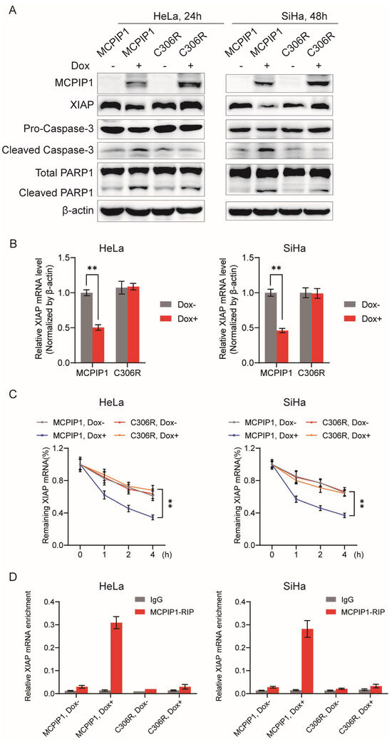 The ZF domain of MCPIP1 mediates its binding to XIAP mRNA and contributes to XIAP mRNA decay. HeLa and SiHa cells were infected with MCPIP1 or C306R lentivirus and treated with or without 1 μg/mL doxycycline for 24 and 48 h, respectively. (A) Protein expression levels of MCPIP1, XIAP, pro-caspase-3, cleaved caspase-3, total PARP1, and cleaved PARP1 were detected by Western blotting. β-actin was used as a loading control. (B) The XIAP mRNA expression was determined by RT-qPCR analysis. (C) HeLa or SiHa cells were further treated with 5 μg/mL actinomycin D for 0, 1, 2, and 4 h and collected to determine the remaining mRNAs of XIAP by RT-qPCR. (D) After an RIP assay with an antibody to MCPIP1 or IgG control, the enrichment of XIAP mRNA by MCPIP1 or C306R protein was examined by RT-qPCR. ** p < 0.01.