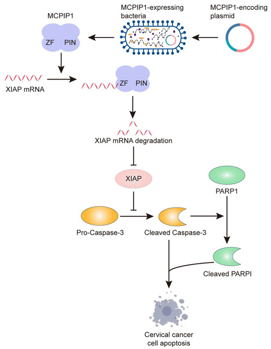 Schematic illustration of the potential mechanism by which MCPIP1 promotes cervical cancer apoptosis. MCPIP1 binds to XIAP mRNA by its ZF domain and degrades it by its endonuclease activity in the PIN domain. As a result, XIAP protein expression was restrained, leading to enhanced expression of cleaved caspase-3 and PARP1 that contributes to cervical cancer cell apoptosis. Through the XIAP/caspase/PARP1 axis, targeted delivery of MCPIP1 with engineered Salmonella typhimurium leads to increased cell apoptosis and inhibited tumor growth in the HeLa xenograft model in mice.