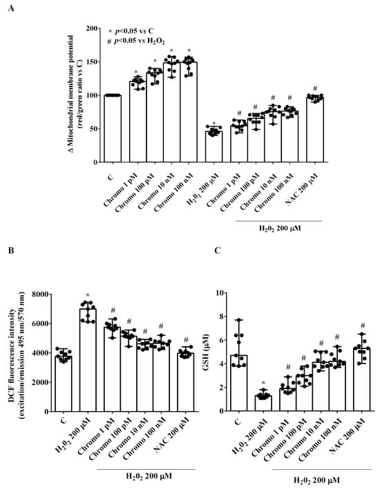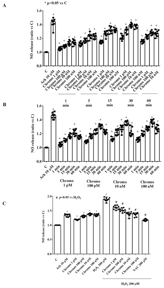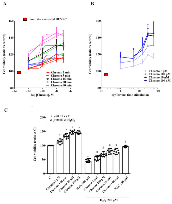 Effects of chromogranin B on cell viability of HUVECs. Panel (A) grading study; Panel (B) time-course study (time stimulation: 1 min, 5 min, 15 min, 30 min, and 60 min); Panel (C) effects of chromogranin B in the presence or absence of H2O2. The results are the medians and range of experiments repeated three times on different pools of HUVECs and triple readings. C = untreated HUVECs (DMSO only). Chromo = chromogranin B. NAC = N-acetylcysteine. In (A,B), the statistical analysis was performed by comparing the different chromogranin B concentrations at each stimulation time through the Kruskal–Wallis test, followed by Dunn’s post hoc test. In (C), the Mann–Whitney test was used to compare the different chromogranin B concentrations (“*” and “#” were considered together) to the controls and H2O2, respectively. A p-value < 0.05 was chosen for statistical significance.