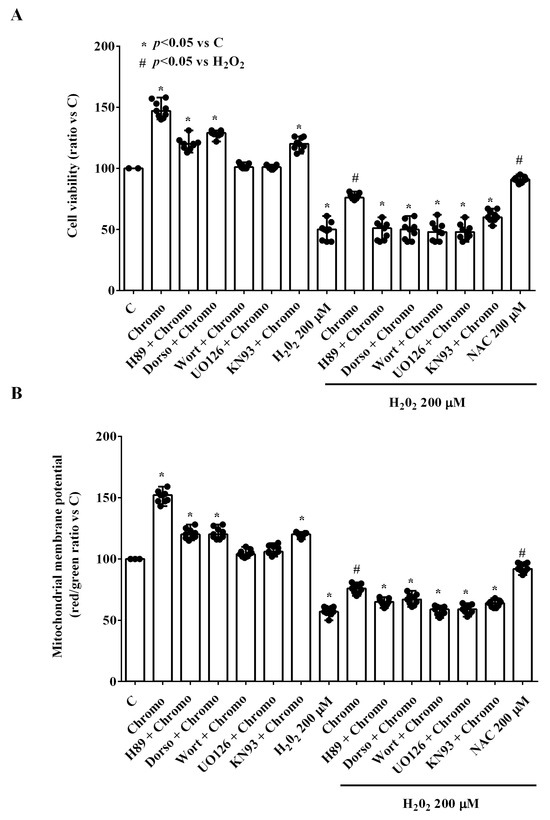 Regarding mitochondrial membrane potential, we observed that MEK1/2 and pan-Pi3K blockers were able to prevent the protective effects of CgB. In the presence of the PKA, AMPK, and CaMKII blockers, the effects of CgB were partially counteracted (Figure 4B and Figure S1B).