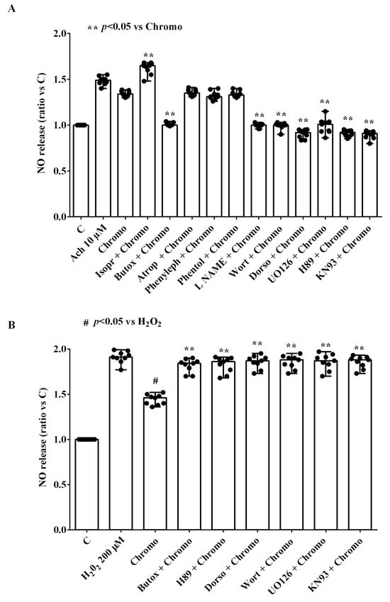 Also, regarding the NO release, we performed a preliminary phase, which was focused on the evaluation of the proper concentration and timing of stimulation for CgB. Some experiments were executed in the presence of H2O2, as well. The experimental protocols were the same followed for cell viability. In addition, in the next phase, CgB at the selected concentration and timing, was administered in the absence or presence of the β-adrenergic receptor agonist, isoproterenol (10 nM; Sigma), the β2-adrenergic receptor antagonist, butoxamine (10 nM; Sigma, dissolved in DMSO), the α-adrenergic receptor agonist, phenylephrine (10 nM; Sigma, dissolved in DMSO) and antagonist, phentolamine (10 nM; Sigma, dissolved in DMSO), the muscarinic receptor antagonist, atropine (10 nM; Sigma, dissolved in DMSO), the NO synthase antagonist, Nω-Nitro-L-arginine methyl ester hydrochloride (10 mM; L-NAME, Sigma, dissolved in DMSO) in addition to H89, dorsomorphin, wortmannin, UOI26, and KN93. The above agonists/antagonists and inhibitors were given in costimulation with CgB. Acetylcholine (10 μM; Sigma, dissolved in DMSO) was used as a positive control.
