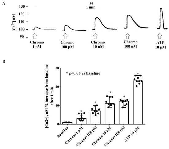 As reported in Figure 6, CgB caused a dose-dependent and transient increase in the [Ca2+]c in HUVECs cultured under physiologic conditions. As depicted in Figure 6, the highest effect on the [Ca2+]c was observed with 10 nM of CgB. The increase in intracellular [Ca2+]c reached a peak approximately 1 min after CgB stimulation and returned to baseline after about 3 min (Figure 6A).