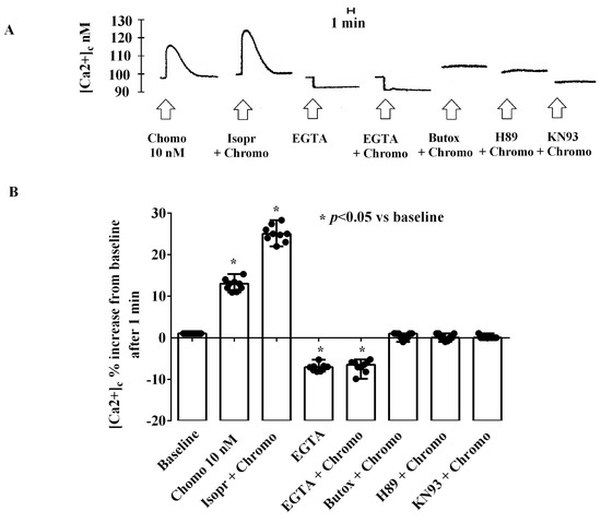 As shown in Figure 7 and Figure S3, the effects of 10 nM of CgB on the [Ca2+]c were almost abolished in HUVECs cultured in a Ca2+-free medium (50 mM of EGTA). In addition, they were potentiated by isoproterenol and abolished by butoxamine, H89, and KN93 (10 nM).
