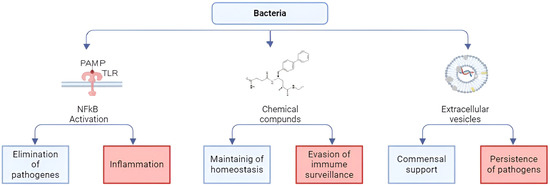 Bacteria modes of action on host cells. Bacteria activate host cells via different ways. First of all, bacteria affect specific receptors of the innate immunity located on the surface and in the cytosol of host cells through pathogen-associated molecular patterns (PAMPs). Activation of PAMPs receptors of innate immunity TLR and NLR triggers a cascade of reactions with activation of the transcription factor NFkB, which normally leads to pathogen elimination. When the NFkB pathway is aberrantly active, inflammation occurs. The second way of action is a non-specific penetration through the host cells of amino acids, vitamins, hormones, short-chain fatty acids, bile acid intermediates, bacteriocins, and other chemical compounds produced by bacteria. Bacterial secretion systems can deliver proteins and nucleic acids directly into the host cell cytosol, directly influencing cellular metabolic processes including facilitating evasion of immune surveillance. The third way bacteria influence host cells is through extracellular vesicles. Extracellular vesicles from commensal bacteria help maintain trained immunity, whereas extracellular vesicles from pathogenic bacteria can alter intracellular pathways and colonize eukaryotic cells.