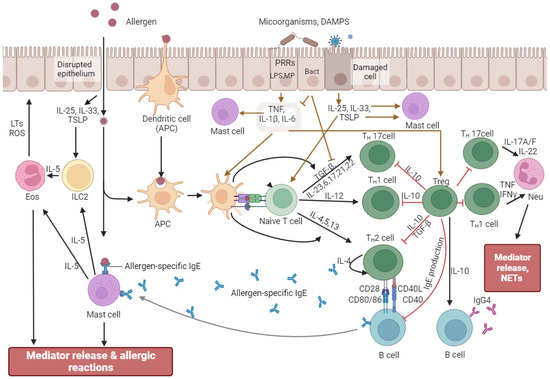Mechanism of formation and attenuation of allergic reactions. Allergens are recognized and processed by dendritic antigen-presenting cells (APCs) to form complexes of major histocompatibility complex class II (MHC II) molecules and antigens, which promote differentiation of naive T cells into Th2 cells. Th2 cells produce proinflammatory cytokines (IL-4, IL-5, IL-13) to activate eosinophils and stimulate IgE synthesis by B cells and subsequent degranulation of mast cells. When microorganisms and/or their metabolic products (brown arrows) affect epithelial cells, the latter produce cytokines (in particular, IL-1, Il-6, TNF), which activate APCs and T regulatory cells (Treg). Tregs can modulate the responses of other T cell populations, changing the direction of the immune response. Allergen-stimulated epithelial cells secrete IL-25, IL-33, and thymic stromal lymphopoietin to activate ILC2, which secretes IL-5, which affects eosinophils, stimulating inflammatory responses. When the epithelial barrier is compromised, allergens directly activate APCs and mast cells, enhancing inflammatory responses. Abbreviations: APCs—antigen-presenting cells; DAMPs—danger-associated molecular patterns; Neu—neutrophils; Eos—eosinophils; ILC2—group 2 innate lymphoid cells; NETs—neutrophil extracellular traps; LTs—leukotrienes; ROS—reactive oxygen species; TNF—tumor necrosis factor; TSLP—thymic stromal lymphopoietin.