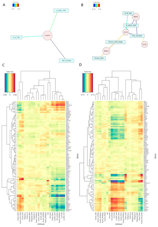 (A)-visualization of the relevance associations network based on the rCCA between distinct clinical datasets characterizing the samples and the Olink measurements based on the urine data. The applied correlation threshold for inclusion in both networks was set to 0.6. (B)-visualization of the relevance associations network based on the rCCA between distinct clinical data sets characterizing the samples and the Olink measurements based on the serum data. (C)-heatmap of the rCCA between distinct clinical datasets characterizing the samples and the Olink measurements based on the urine data. The dendrogram in the heatmap was computed with the complete linkage method to find similar clusters based on the Euclidean distance. (D)-heatmap of the rCCA between distinct clinical datasets characterizing the samples and the Olink measurements based on the serum data. The dendrogram in the heatmap was computed with the complete linkage method to find similar clusters based on the Euclidean distance. All clinical data beginning with “Event_” indicate the samples belonging to a specific timeframe; these timeframes are highly correlated to features such as “day of life”, “day after IVH” or “GA of the sample”.