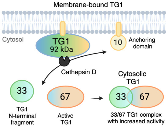 - Steinert, P.M.; Chung, S.-I.; Kim, S.-Y. Inactive zymogen and highly active proteolytically processed membrane-bound forms of the transglutaminase 1 enzyme in human epidermal keratinocytes. Biochem. Biophys. Res. Commun. 1996, 221, 101–106. [Google Scholar] [CrossRef] [PubMed]