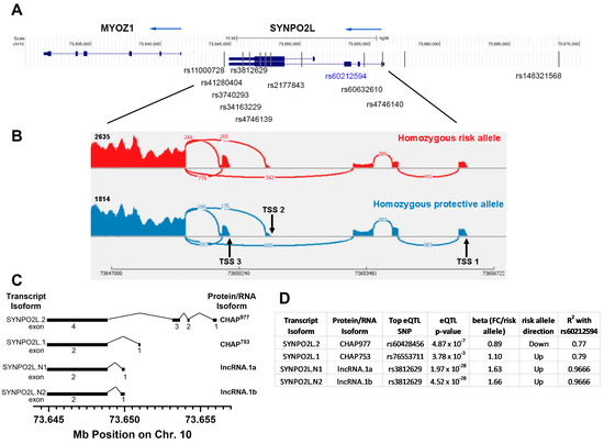 SYNPO2L MYOZ1 gene locus and transcript isoforms. (A) Gene cluster and positions of some relevant SNPs. (B) IGV browser Sashimi plot showing LAA RNAseq exon and splice junction reads for one representative subject each homozygous for the risk or protective allele of rs60212594. (C) Map of four SYNPO2L transcript isoforms, showing three transcription start sites (TSS) and one alternative splice donor yielding two protein coding and two long noncoding RNAs (lncRNA) transcript isoforms. (D) Top eQTLs for the four SYNPO2L transcript isoforms along with their p-values and beta coefficients.