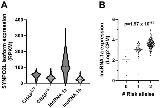 LAA expression of the four SYNPO2L isoforms. (A) Relative expression levels of the four transcript isoforms in human LAA in RPKM (reads per kilobase per million mapped reads). (B) The effect of the AF GWAS risk allele of rs60212594 on the expression of the SYNPO2L.N1 isoform encoding lncRNA.1a (log2 counts per million, p-value = 1.97 × 10−28 by linear regression adjusted for surrogate variables, age, and sex, red line denotes median value).