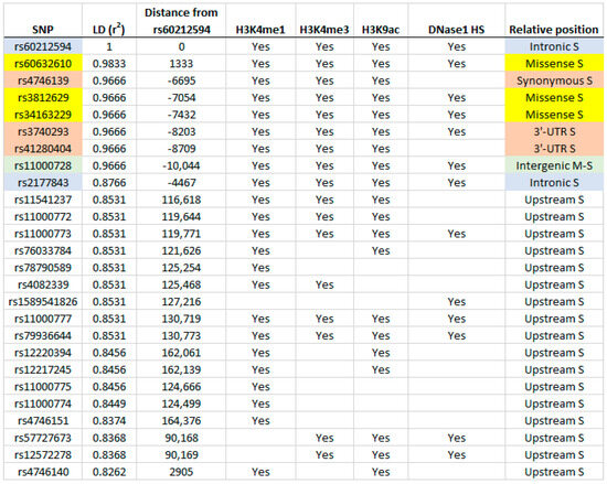 Candidate regulatory and missense SNPs in linkage disequilibrium with rs60212594. Missense SNPs (highlighted in yellow); SYNPO2L intronic SNPs (highlighted in blue); intergenic SNP between the MYOZ1 and SYNPO2L genes (highlighted in green); synonymous SNPs in the coding region or in the 3′ UTR (highlighted in pink). Regulatory marks include histone 3 lysine 4 mono methylation and trimethylation (H3K4me1 and H3K4Me3), histone 3 lysine 9 acetylation (H3K9ac), and DNase1 hypersensitivity (DNase1 HS). Relative positions to SYNPO2L gene (S) and MYOz2 gene (M).