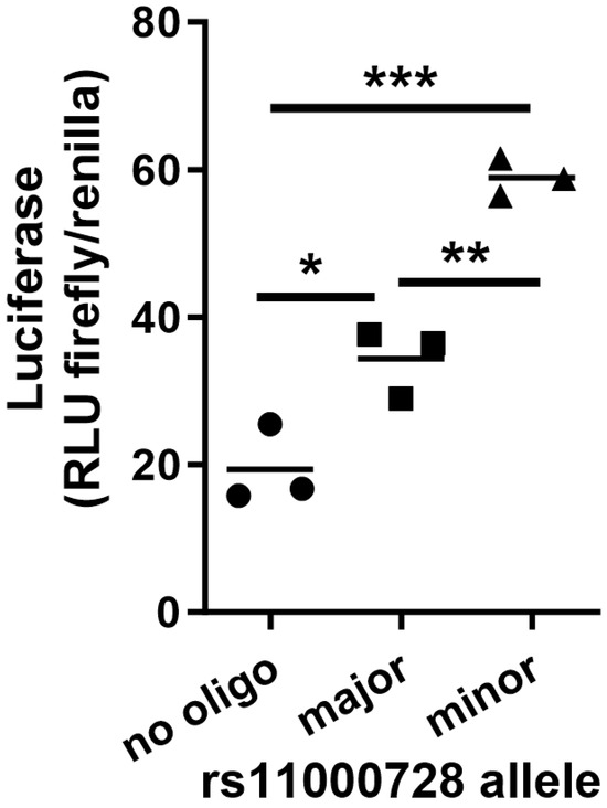 Dual luciferase reporter gene transfection in iCMs with plasmids containing 30-mer oligos surrounding rs110000728. Enhancer activity was observed for both alleles but was ~2-fold weaker for the major/risk allele concordant with its effect on the LAA expression of MYOZ1. * p < 0.05; ** p < 0.01; *** p < 0.001.