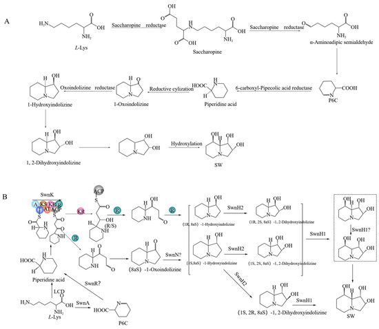 L-PA was converted to (8aS)-1-oxoindolizine, (1R,8aS)-1-hydroxyindolizine, or (1S,8aS)-1-hydroxyindolizine by the action of multifunctional SwnK protein. Subsequently, (8aS)-1-oxoindolizine was synthesized form (8aS)-1-hydroxyindolizine by SwnN enzyme. (1R,2S,8aS)-1,2-dihydroxyindolizine was synthesized from (1R,8aS)-1-hydroxyindolizine by the action of the SwnH2 enzyme, (1S,2S,8aS)-1,2-dihydroxyindolizine was synthesized from (1S,8aS)-1-hydroxyindolizine by the action of the SwnH2 enzyme. Finally, (1S,2S,8R,8aR)-1,2,8-octahydroindolizinetriol (SW) was synthesized from (1R,2S,8aS)-1,2-dihydroxyindolizine or (1S,2S,8aS)-1,2-dihydroxyindolizine catalyzed by SwnH1 enzyme.