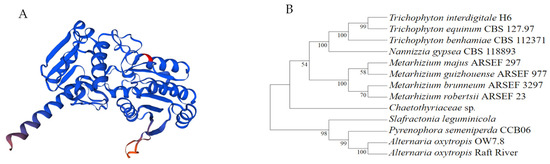 The nucleotide sequence identity of swnN gene between A. oxytropis OW 7.8 and A. oxytropis Raft River (KY365741.1) was 99.91% indicating a close phylogenetic relationship, with one synonymous mutation (at 1053, C in OW 7.8 and G in Raft River, both encoding threonine). The identity of SwnN amino acid sequence was 100% between A. oxytropis OW 7.8 and A. oxytropis Raft River, while the identity between A. oxytropis OW 7.8 and M. robertsii ARSEF 2575 was 84.03%. The phylogenetic relationship of SwnN protein (Figure 2B) in SW-producing fungi is consistent with that in the fungi reported by Neyaz et al. [32].
