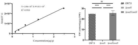 SW level on day 20 in A. oxytropis OW 7.8, ΔswnN and ΔswnN/swnN. Error bars represent the standard error of the mean (n = 3), (****) p < 0.0001. ns: not significant.