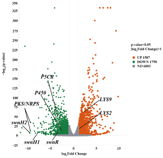 There was no swnN transcripts detected from ΔswnN transcriptomics. Transcriptome sequencing of A. oxytropis OW 7.8 and ΔswnN produced a total of 254,788,656 clean reads, amounting to 38.21 G. Gene differential expression was shown between A. oxytropis OW 7.8 and ΔswnN. A total of 3385 DEGs were identified, of which 1587 (46.89% of DEGs) were up-regulated and 1798 (53.11%) were down-regulated. Five DEGs closely related to SW synthesis were identified, among which the gene of sac was up-regulated, while the genes of swnR, swnK, swnH1, and swnH2 were down-regulated (Figure 7).