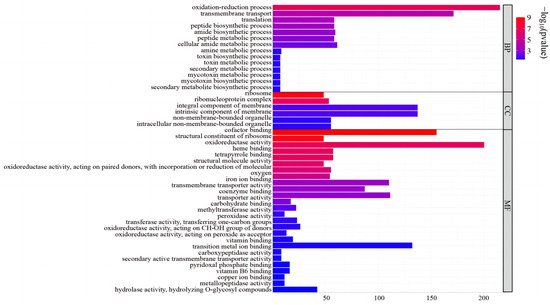GO functional enrichment analysis of DEGs between A. oxytropis OW 7.8 and ΔswnN showed that 701 DEGs (277 up-regulated and 424 down-regulated) were assigned to 47 GO terms. In the Biological Process (BP) category, the top three enriched metabolic groups were oxidation–reduction process (30.67%), transmembrane transport (24.39%), and cellular amide metabolic process (8.70%). In the Cellular Component (CC) category, the top three groups were membrane component (19.54%), intrinsic component of membrane (19.54%), and non-membrane-bounded organelle (7.85%). In the Molecular Function (MF) category, the top three groups were oxidoreductase activity (28.53%), cofactor binding (22.11%), and transition metal ion binding (18.83%) (Figure 8).