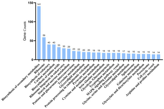 KEGG enrichment analysis of DEGs between A. oxytropis OW 7.8 and ΔswnN annotated 553 DEGs (301 up-regulated and 252 down-regulated) to 97 pathways. The top three metabolic groups (Figure 9) included biosynthesis of secondary metabolites (25.50%), ribosome (10.04%), biosynthesis of cofactors (7.23%), and carbon metabolism (7.23%).