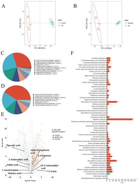 The principal component analysis (PCA) of the metabolomic data for A. oxytropis OW 7.8 and ΔswnN is shown in Figure 10A,B, indicating differences in metabolites between ΔswnN and A. oxytropis OW 7.8. In positive ion mode, the most abundant metabolites were lipids and lipid-like molecules (30.04%), followed by organic acids and derivatives (23.99%), and organoheterocyclic compounds (14.48%). In negative ion mode, the most abundant metabolites were lipids and lipid-like molecules (40.84%), followed by organic acids and derivatives (20.30%), nucleosides, nucleotides, and analogues (10.89%), and alkaloids and derivatives (9.90%) (Figure 10C,D,G,H). In positive ion mode, 733 DEMs were identified, with 258 up-regulated and 204 down-regulated. In negative ion mode, 271 DEMs were identified, with 172 up-regulated and 99 down-regulated (Table 2).