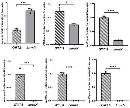RT-qPCR results indicated that the relative expression levels of the sac gene in ΔswnN are significantly increased compared to A. oxytropis OW 7.8. Conversely, the relative expression levels of the P5CR, swnH1, swnH2, swnK, and swnR genes significantly decreased (Figure 11).