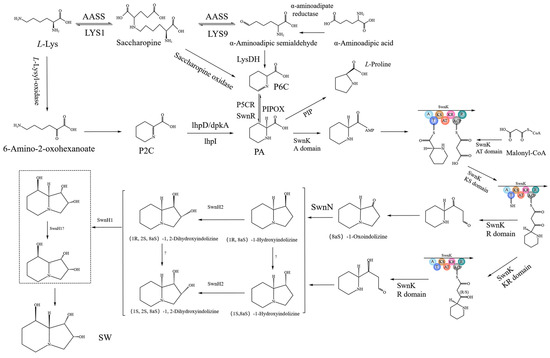 The predicted SW biosynthesis pathway in A. oxytropis OW 7.8 is shown in Figure 12, starting from L-lysine artificially. The Sac enzyme catalyzes the synthesis of saccharopine from L-Lysine. Saccharopine is reduced to α-aminoadipic semialdehyde (α-aminoadipic semialdehyde is also formed from α-aminoadipic acid catalyzed by α-aminoadipate reductase). α-Aminoadipic semialdehyde cyclizes to form P6C (P6C is also formed from saccharopine catalyzed by saccharopine oxidase). P6C is then catalyzed by the P5CR enzyme or SwnR enzyme to form L-PA. There might be an alternative pathway synthesizing L-PA, in which L-lysine is converted to 6-amino-2-oxohexanoate catalyzed by L-lysyl-alpha-oxidase. 6-Amino-2-oxohexanoate isomerizes to form P2C, which is subsequently catalyzed by the enzymes lhpD/dpkA/lhpI to produce L-PA.