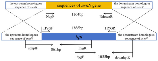 The upstream and downstream homologous sequences of the swnN were amplified using the genomic DNA of A. oxytropis OW 7.8 as a template and primers upF/upR (5′-CTGGCTAGCTGCATATGCAGCAG-3′; 5′-CTGGCTAGCTGCATATGCAGCAG-3′) and downF/downR (5′-ATAGAGTAGATGCCGACCGCGGGTTCGCCATCCATGGAGGCCTCAT-3′; 5′-CGTGGCAGTTGATGACTGGG-3′). The hpt 5′ and 3′ end sequences were amplified using the pCB1003 plasmid as a template and primers HYGF/hygR (5′-GGCTTGGCTGGAGCTAGTGGAGGTCAA-3′; 5′-GTATTGACCGATTCCTTGCGGTCCGAA-3′) and hygF/HYGR (5′-GATGTAGGAGGGCGTGGATATGTCCT-3′; 5′-GAACCCGCGGTCGGCATCTACTCTAT-3′). The upstream and downstream homologous sequences of the swnN were linked to the hpt gene on both sides using the split-marker technique to construct the swnN gene knockout cassette, and this cassette was then ligated into the pMD-19T vector (Takara, Beijing, China) using TA cloning to make up the swnN gene knockout vector (Figure 13).