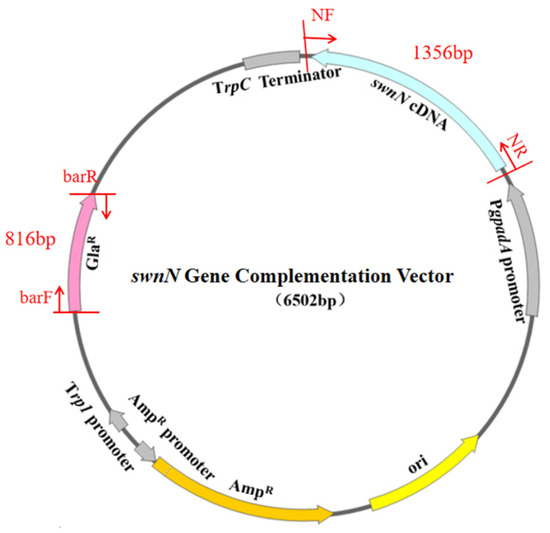 The pBARGPE1-EGFP vector (MIAO LING BIOLOGY, Wuhan, China) was digested with EcoRI (Takara, Beijing, China) and BamHI (Takara, Beijing, China), reaction at 37 °C for 4 h, enzyme inactivation at 60 °C for 15 min. The swnN cDNA with homologous regions of the vector was ligated into the above linearized pBARGPE1-EGFP vector by seamless cloning. The bar was used as a selection marker, with PgpdA as the promoter and TtrpC as the terminator, to drive the expression of swnN cDNA.