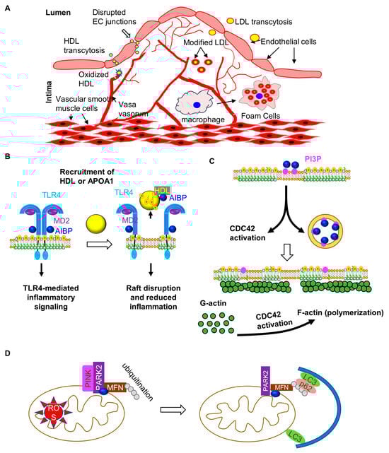 (A). Lipoprotein penetration and retention in the sub-endothelium. Hyperlipidemia contributes to greater LDL and HDL presence in the subendothelial space, where they are rendered proinflammatory. These modified lipoproteins will be taken up by macrophages, which subsequently become lipid-laden foam cells. (B). AIBP impedes TLR4-mediated inflammatory signaling in myeloid cells. TLR4 dimerization is essential for the innate inflammatory response. AIBP binds TLR4, enabling a targeted cholesterol efflux, which disrupts TLR4 dimerization and represses signaling. This AIBP-mediated effects result in inhibited inflammatory responses. (C). AIBP regulation of lipid rafts via cytoskeleton rearrangement. AIBP binds PI(3)P, activating CDC42, and triggering actin polymerization, which consequently reduces the lipid raft levels. (D). AIBP regulates mitophagy. Mitochondrial AIBP binds PARKIN and MFN and increases the ubiquitination of MFN. Ubiquitinated MFN will recruit P62, which in turn facilitates the LC3 interactions, thereby targeting these mitochondria for degradation via autophagy.