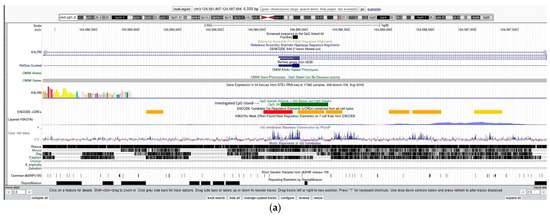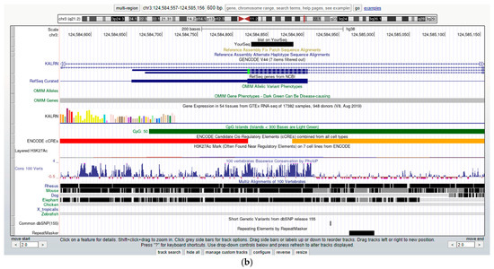 Candidate region analyzed through pyrosequencing. The analyzed chr3:124584826–124584886 (hg38) region—highlighted in green—is reported with (a) a 2 kb and (b) a 200 bp zoom. The picture was created through the UCSC Genome Browser tool (https://genome-euro.ucsc.edu, accessed on 22 January 2024).