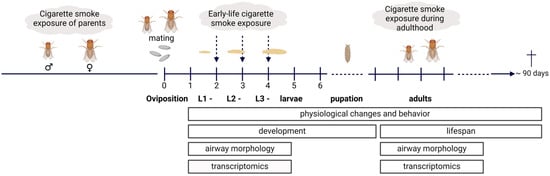 - Sirocko, K.T.; Angstmann, H.; Papenmeier, S.; Wagner, C.; Spohn, M.; Indenbirken, D.; Ehrhardt, B.; Kovacevic, D.; Hammer, B.; Svanes, C.; et al. Early-life exposure to tobacco smoke alters airway signaling pathways and later mortality in D. melanogaster. Environ. Pollut. 2022, 309, 119696. [Google Scholar] [CrossRef]