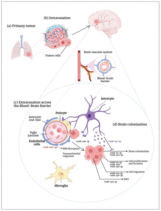 Other cell lineages, in addition to cancer cells, also serve as the source of miRNAs associated with brain metastasis, such as miR-1207-5p in BEMCs, showing the relevance of cancer cells’ interactions with the brain microenvironment. Researchers found that the long non-coding RNA, lnc-MMP2-2, is abundant in exosomes derived from TGF-β1-stimulated A549. The lnc-MMP2-2 found in TGF-β1 exosomes suppresses the expression of miR-1207-5p in BMECs, which leads to the increased production of its target protein, erythrocyte membrane protein band 4.1 like 5 (EPB41L5). When lnc-MMP2-2 and EPB41L5 are overexpressed in BMECs, it promotes markers of EMT, disrupts tight junctions, and increases the permeability of the BMEC monolayer in vitro. Furthermore, the overexpression of miR-1207-5p in BMECs leads to increased expression of tight junction proteins and reduces BMECs’ monolayer permeability, indicating the miRNA’s regulatory function. These changes result in a higher permeability of BBB, facilitating the entry of lung cancer cells into the brain and promoting brain metastasis in vivo (Figure 1b) [].
