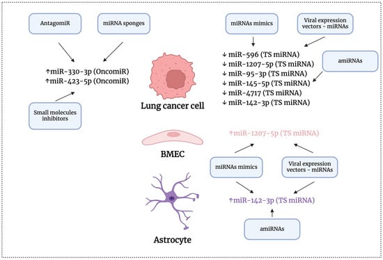 Besides being potential biomarkers, dysregulated miRNAs can act as oncogenic (oncomiRs) or tumor suppressor (TS) miRNAs, depending on their expression context and the target genes they regulate. Oncogenic miRNAs, or oncomiRs, promote carcinogenesis and tumor progression by targeting tumor suppressor genes and critical pathways associated with cancer suppression. Conversely, TS miRNAs inhibit the expression of genes that promote oncogenesis, thus suppressing tumor formation. OncomiRs are usually upregulated in cancer cells, and TS miRNAs are downregulated. In lung cancer patients with brain metastasis, upregulated miRNAs such as miR-21, miR-328, miR-378, miR-550a, and miR-378 are associated with mechanisms promoting metastasis as oncomiRs. On the other hand, downregulated miRNAs like miR-193b, miR-215-3p, miR-217, and miR-768-3p are linked with metastasis-preventing mechanisms as TS miRNAs (Table 2).