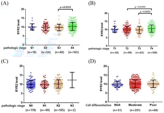 We evaluated the clinical results of the carriers of the RYR2 gene and OSCC patients in the TCGA database. OSCC patients in pathological stage IV showed significantly higher levels of RYR2 than those in other pathological stages (p = 0.0315) (Figure 2A). Additionally, higher RYR2 levels were also detected in patients with T4 cancer than those with T2 and T3 cancer (p = 0.0349 and 0.0092, respectively) (Figure 2B). However, there were no significant differences between RYR2 levels and lymph node metastasis, nor between RYR2 levels and histologic grade (Figure 2C,D). The findings demonstrate the importance of the pathological stage and tumor size in the genetic association between the expression of the RYR2 gene and OSCC.