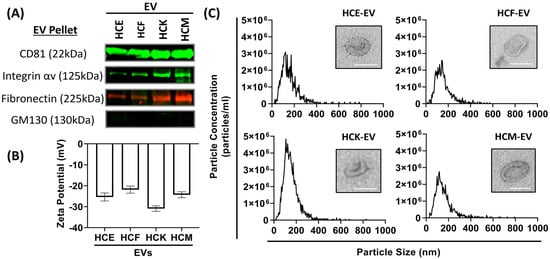 2.1. Characterization of HCE-, HCK-, HCF- and HCM-EVs