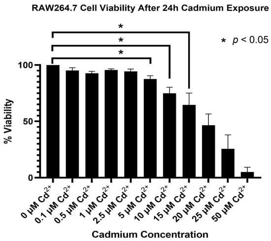 2.1. Cadmium Toxicity Is Dose-Dependent in RAW 264.7 Murine Macrophages