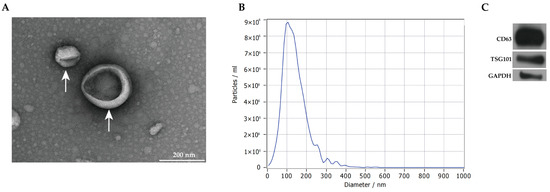 CS-EV extraction was performed as described previously [17]. Briefly, six-week-old Sprague-Dawley rats were infected with 200 metacercarias via gastric administration. Six weeks after infection, the rats were euthanized by cervical dislocation. Adult liver worms were collected and cultured in RPMI-1640 medium for 24 h. The medium from the cultures was centrifuged at 3000× g and 12,000× g for 30 min to collect excretory–secretory products (ESPs). After filtering, two rounds of centrifugation at 120,000× g for 90 min were completed to precipitate CS-EVs. The precipitates were dissolved in 400 µL of PBS. Transmission electron microscopy (TEM), nanoparticle tracking analysis (NTA) and Western blot were used to identify CS-EVs as mentioned previously [17].