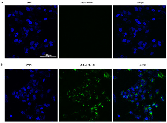 The uptake of CS-EVs by RBE cells was verified by confocal microscopy with PKH-67 labeling (green). RBE cells were incubated with the PKH67-PBS control (A) and 10 μg of PKH67-CS-EVs (B) for 24 h.