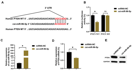 Dual luciferase assay and cell transfection demonstrated csi-miR-96-5p inhibited PTEN expression. (A) The binding sites are shown in red, and relative mutant nucleotides are shown below. (B) csi-miR-96-5p inhibited the 3′-UTR-luciferase reporter gene of wild-type PTEN but had no significant effect on the other groups. (C–E) After transfection, the expression of PTEN was detected by qPCR and Western blot. ns, not significant difference; * means p < 0.05.