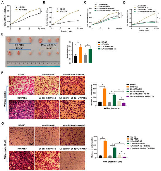The csi-miR-96-5p/KO-PTEN axis in promoting CCA progression. (A–D) Proliferation of RBE cells was detected by CCK-8 assay with or without erastin. (E) Proliferation of HuCCT1 cells was detected by subcutaneous tumor. (F,G) Transwell assay was used to detect migration of RBE cells with or without erastin. After 24 h of cell culture, crystal violet staining was performed. The number of cells was observed under a 10-fold eyepiece using a light microscope. Five fields of view were randomly selected under the microscope to count the migrated cells. csi-miR-96-5p and KO-PTEN prominently increased migration. Erastin significantly reduced the migration of the negative control group, but had no significant effect on the csi-miR-96-5p and KO-PTEN group. LV, lentiviral vector transfection; KO, lentiviral knockout; OV, lentiviral over-expressed. The data are shown as the mean ± SD; * means p < 0.05.
