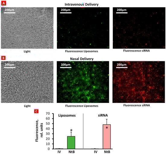 Accumulation of liposomes (green) and siRNA (red) in brain tissue after intravenous (A) and nasal (B) delivery. Representative confocal fluorescence microscope images of frozen 5 µm brain tissue sections. Average fluorescence intensity (C); n = 6, means + SD are shown. * p < 0.05.
