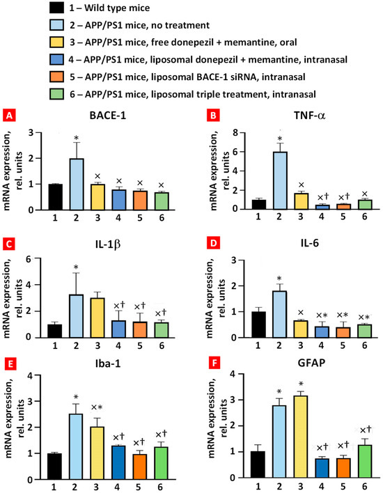 Expression of BACE-1 (A), TNF-α (B), IL-1β (C), IL-6 (D), Iba-1 (E), and GFAP (F) mRNAs in mouse brain tissues. Means ± SD are shown. * p < 0.01 when compared with wild-type mice (bar 1); × p < 0.05, when compared with APP/PS1 mice, no treatment (bar 2); † p < 0.05, when compared with APP/PS1 mice, free donepezil + memantine, and oral (bar 3) (n = 3).